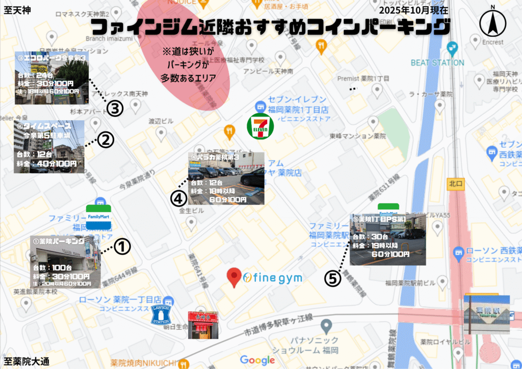 ファインジムから比較的近く、ご利用頂きやすいパーキングを下図にまとめております。