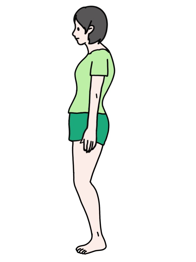 A. 鏡で横向きに立ち、耳の穴、肩峰(肩の一番出っ張った骨)、骨盤の突起(上前腸骨棘)が一直線上にあるか確認してください。耳の位置や骨盤が前方に偏っている場合はヘッドフォワードやスウェイバックが疑われます。